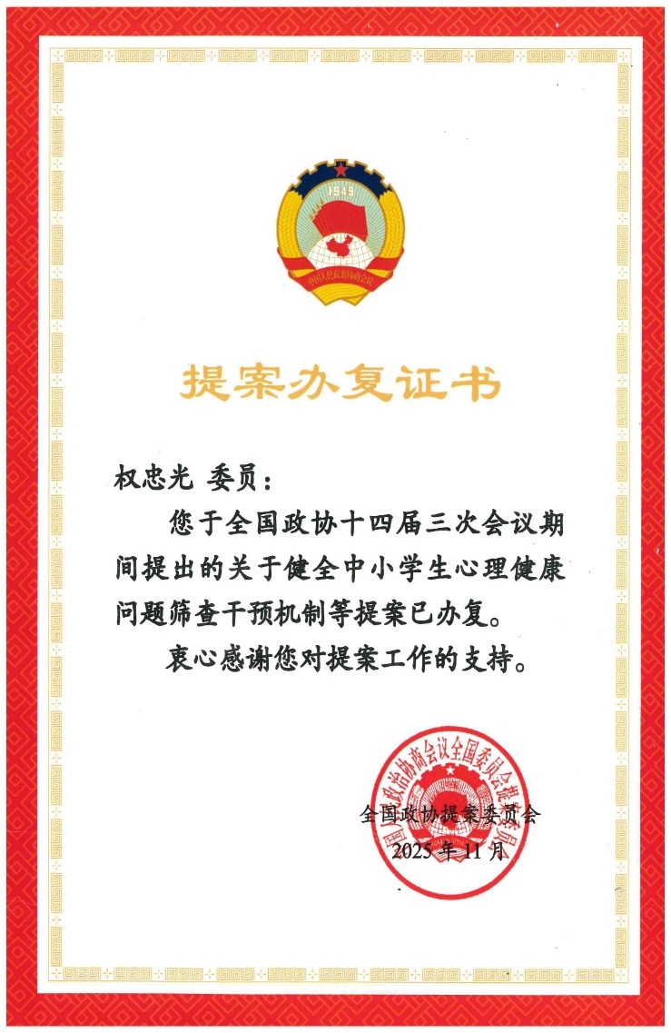 日前,第十四届全国政协委员、北京新联会会长、中企华评估公司董事长权忠光收到来自全国政协提案委员会的提案办复证书,对他在全国政协十四届三次会议期间提出的关于健全中小学生心理健康问题筛查干预机制等提案回复已办复,并对权忠光给予全国政协提案工作的支持表示衷心感谢!
